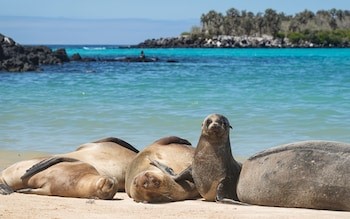 Upon arrival, we disembarked and hiked up a path of stairs to the island's summit for panoramic views of the volcanic formations and Pinnacle Rock. We then dropped anchor at Playa Dorada, for snorkeling and where we also spotted sea lions, turtles, exotic fish, and even a few Galapagos penguins. After lunch on board the yacht, we returned to Puerto Ayora, accompanied part of the way by a school of dolphins.Â